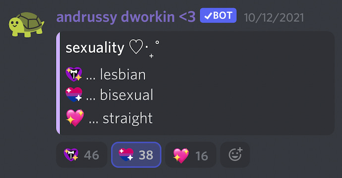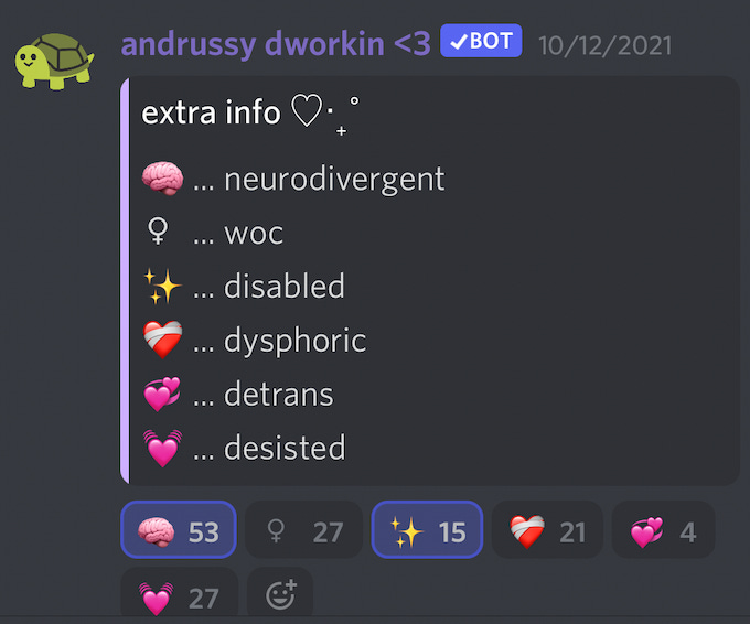 Don’t be fooled by the cutesy emote — this was the most hateful server I spent time in, by far. The server’s description on Disboard reads, “welcome to radfem hangout ╰(´︶`)╯♡ we're a server aimed towards younger radical feminists, female only! transmen are welcome to join. see you there! <3”. The server has 131 members at the time of writing, and requires potential members to answer two questions before they can join: