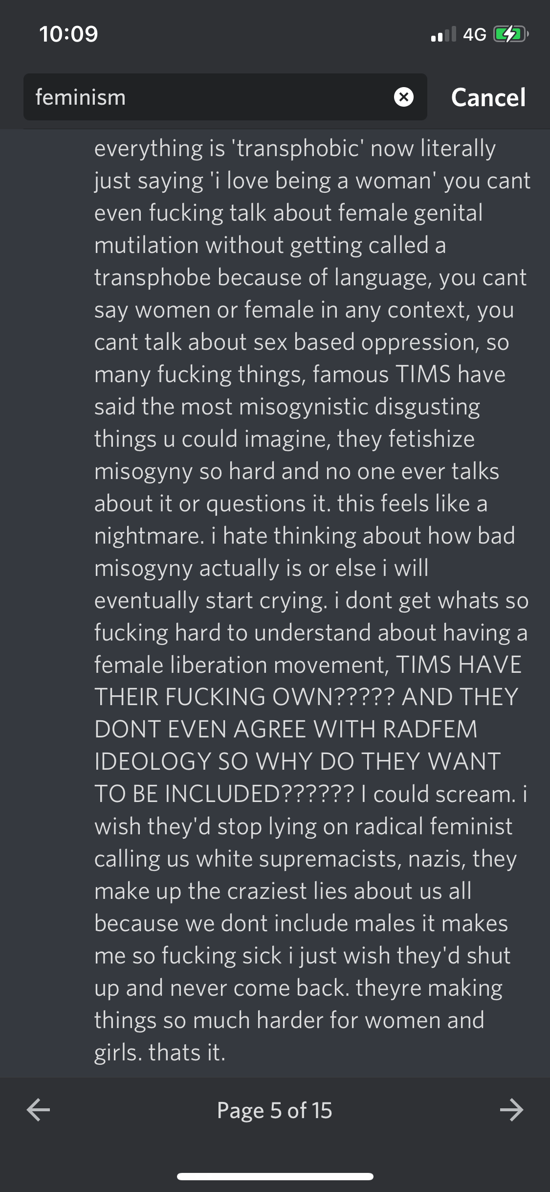 In steps radical feminism, whether it’s on TikTok, Twitter, Tumblr, or elsewhere, and it feels like a godsend. Here is a feminism that addresses the root of all of my problems as a teenage girl: the patriarchy. Here is a feminism that doesn’t require me to be a Boss or to be Beautiful but one that lets me express my rage as a woman in a sexist society. Here is a feminism that talks about my experiences as a woman who is not interested in dating men. Here is a feminism that doesn’t focus on individual empowerment but on systemic justice for women as a class.