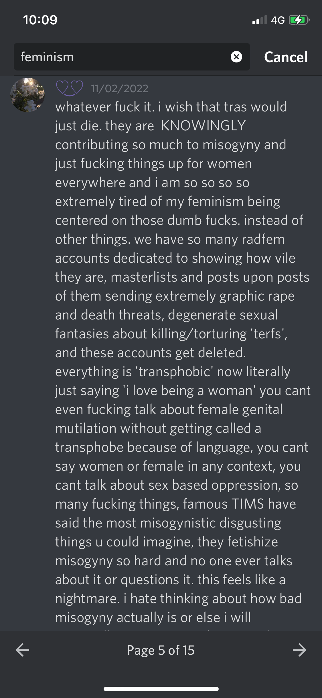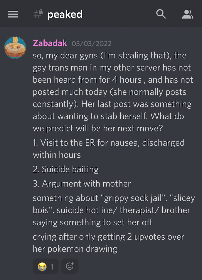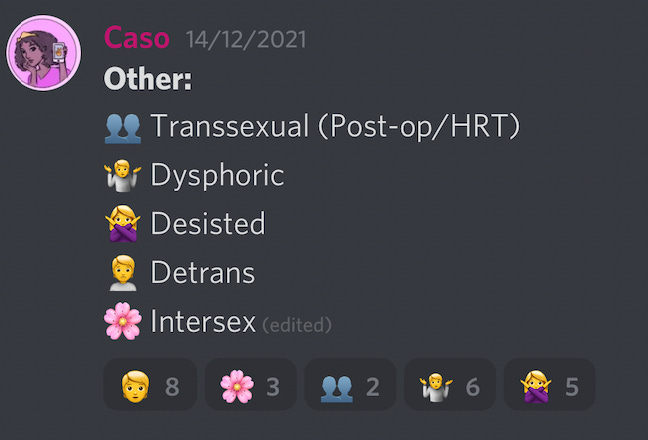 Discord was, by far, the most depressing part of my experiment. Seeing so many young women use such hateful and violent rhetoric, egging each other on and coaxing one another further into radicalisation, made me profoundly sad. The naive optimist in me hopes that some of this hatefulness will soften with age, but in the meantime, the trans people in their lives and the trans people they encounter online will experience very real harm at their hands.
