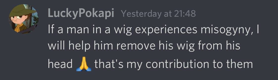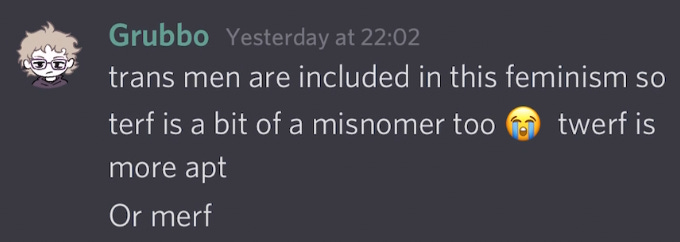 This kind of talk is… way above my pay grade, and should probably be reserved for sessions with a therapist. But it was incredibly disturbing to see, particularly knowing that trans people are four times more likely than cis people to be victims of violent crime, including rape and sexual assault. Consider the young ages of some of the users of these servers, and then consider the statistic that 12 percent of trans youth have reported being sexually assaulted by peers or staff in K-12 settings. Suddenly, the violence they fantasise about becomes less of a fantasy and more of a reality, just like it is for cis women. Instead of using these shared experiences to build solidarity, however, TERFs just devolve into hateful speech and disturbing pronouncements.