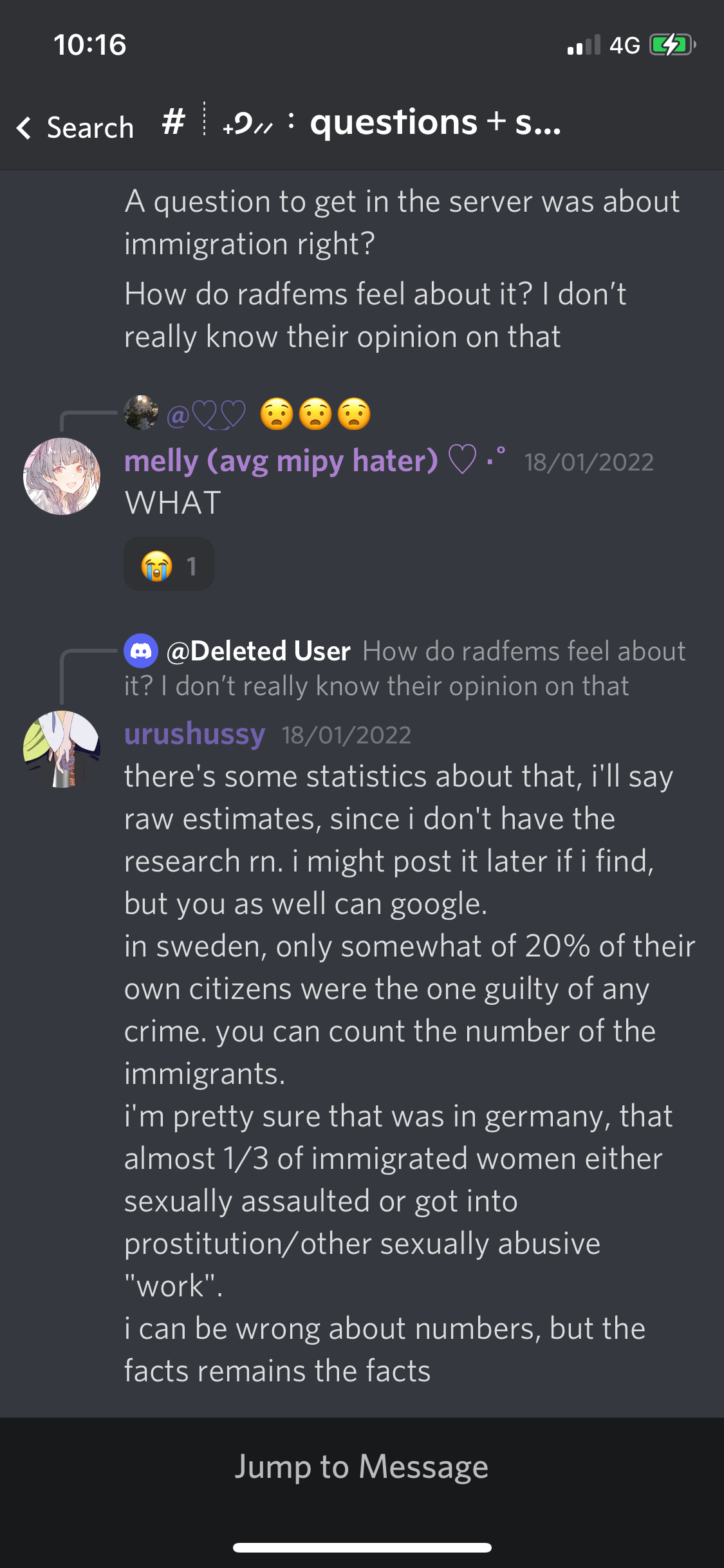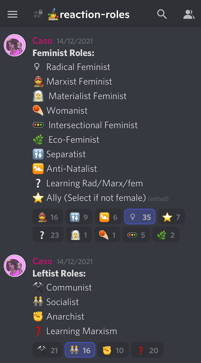By ‘younger radical feminists’, the server primarily means teenagers; the owner is 17, based in North America, and a lesbian. Based on the roles, the majority of users are underage, but there were 38 adults in the server, with most underage users being 16 or 17.