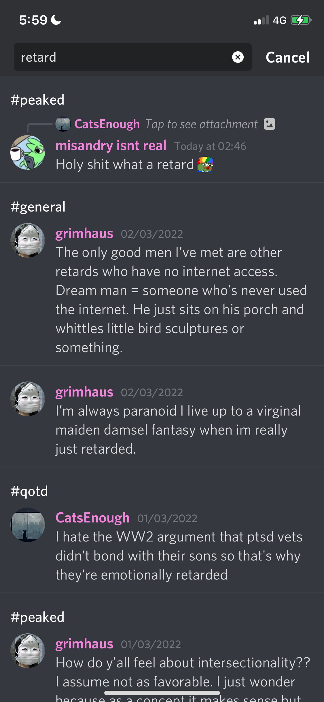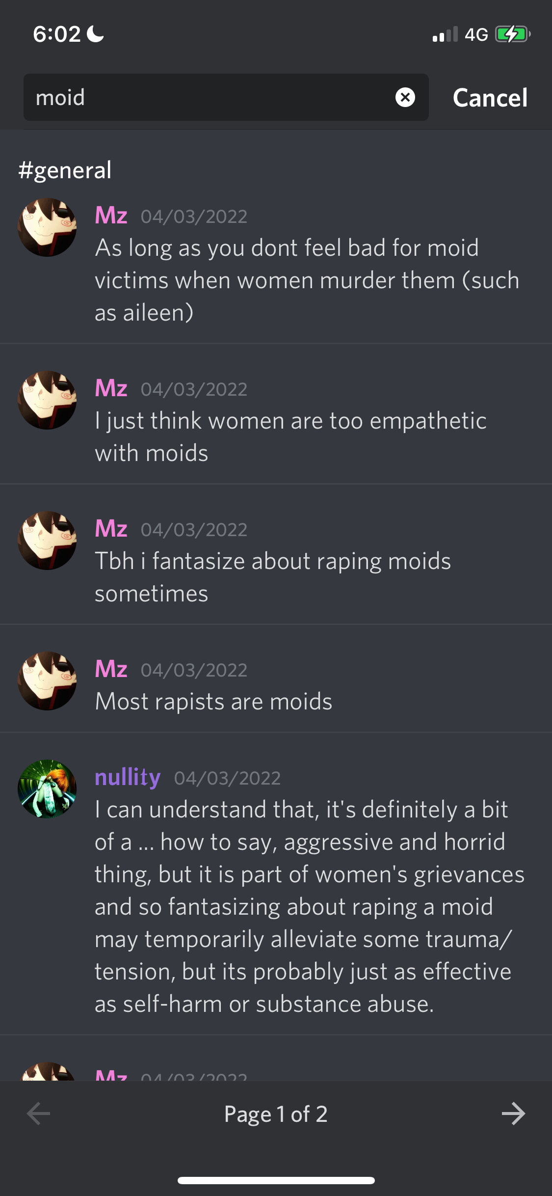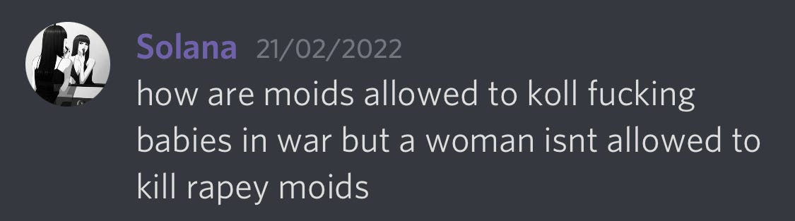 The founder of the server responds with, “fantasizing about raping a moid may temporarily alleviate some trauma/tension”, but ultimately concedes that it’s about as effective as self-harm or substance abuse.