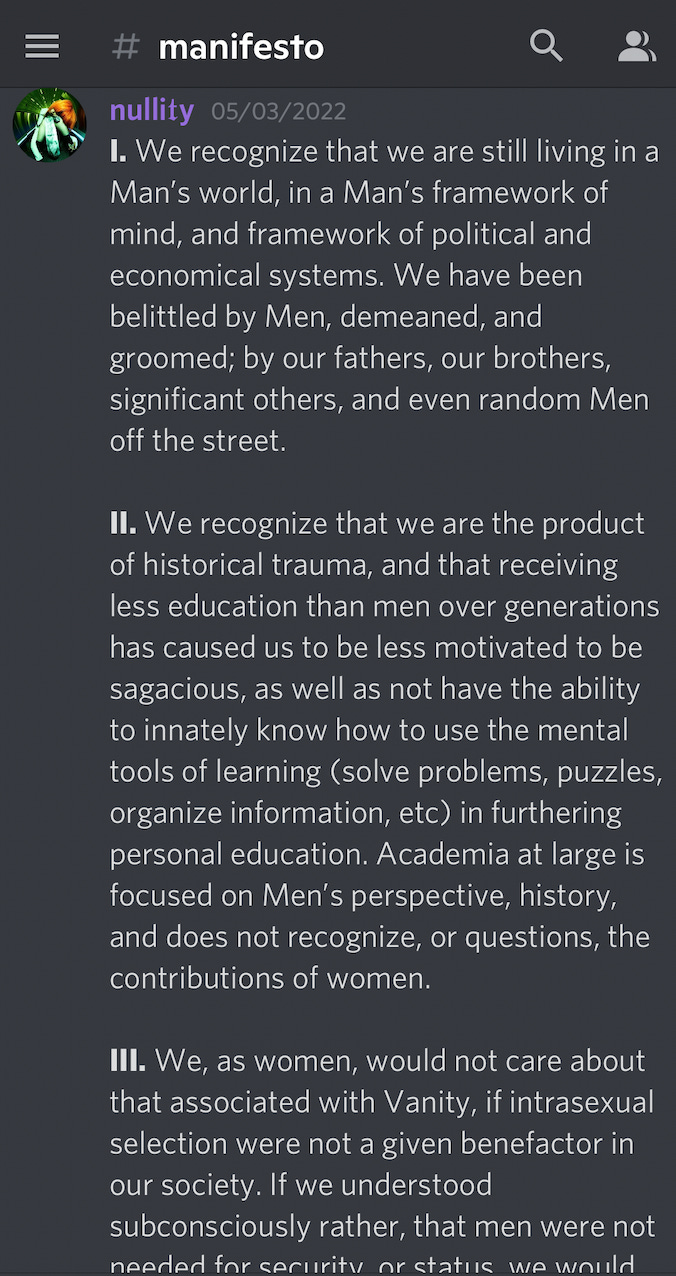 Discord gave me a glimpse at what radical feminism looks like outside the Anglosphere; while all of the servers were dominated by users from the US, Canada, and Europe, there were several vocal members from countries like Germany and Russia as well as Morocco and Malaysia.