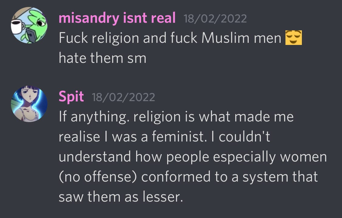 I asked Lauren (gothamshitty) if she’d encountered anti-Muslim sentiment during her time on radfem Tumblr, and she said, “Yes to the anti-muslim sentiment. Although I've seen radfems condemn religion altogether, they seem to view Islam as uniquely oppressive/"backwards". I remember seeing tumblr TERFs talk about their fears of Syrian refugees entering Europe and promoting the false (alt right) narrative that more refugees meant more violence against European women. I've also seen them avoid pro-Palestinian stances because of "the way middle eastern men treat their women.”
