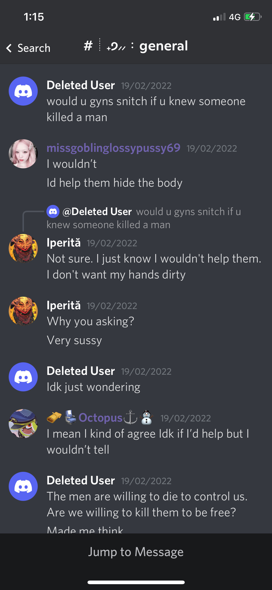 See also: this conversation about whether users would snitch if someone they knew killed a man.
