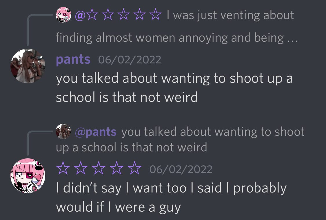 There was also a baffling exchange where one user said if they were a guy they would probably want to shoot up a school.