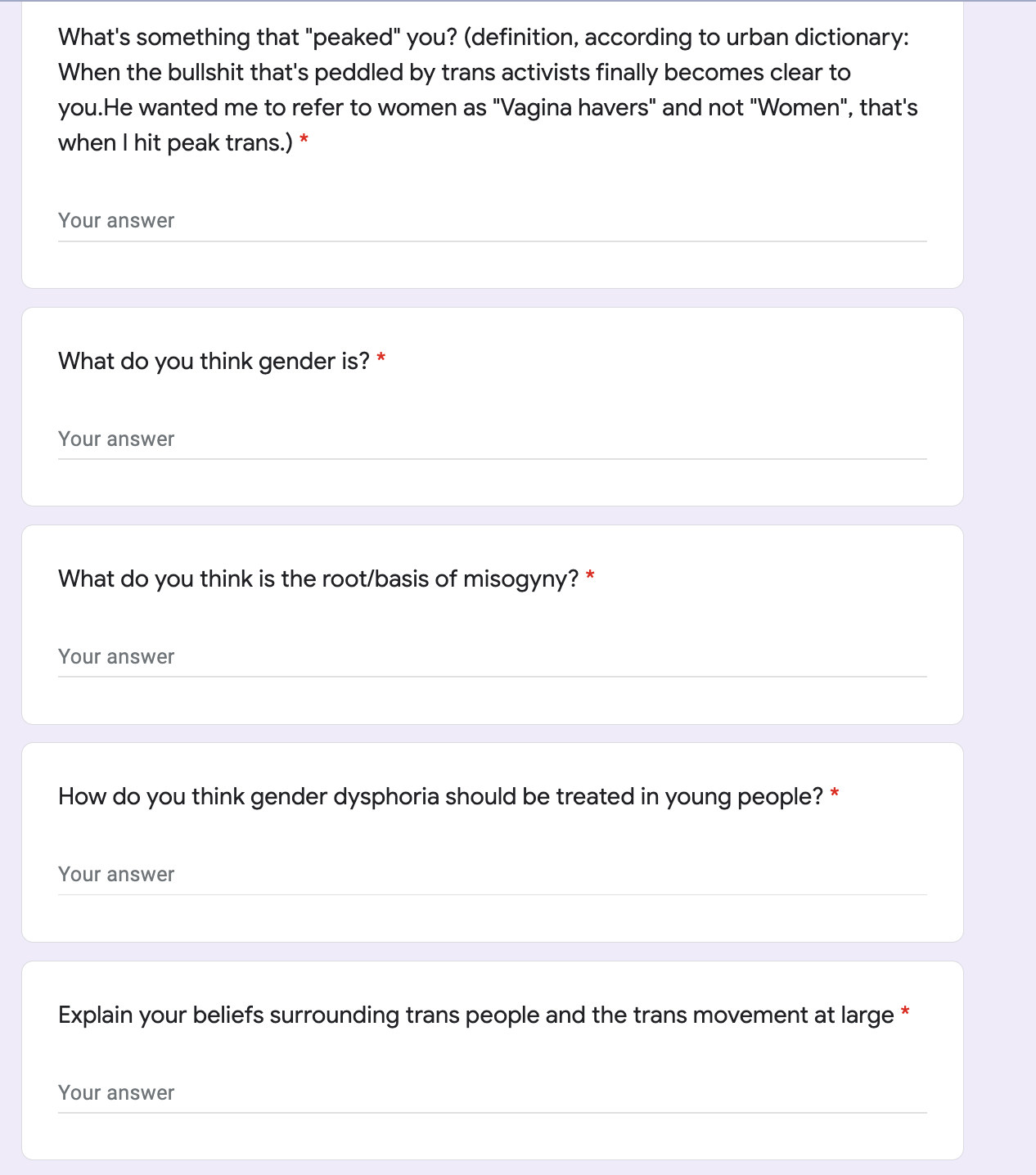 I’m being 100% serious when I say that applying for university required less effort than this. I genuinely cannot recall encountering anything like this, where people are so determined to keep people who disagree out of their space that they require them to answer a TERF pop quiz. Facebook groups can ask potential members to answer as many as three questions, but they’re usually along the lines of “do you agree to follow the rules”, not “do you agree that trans children should be denied gender affirming care”.
