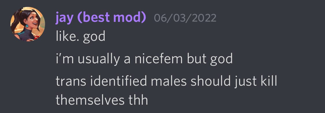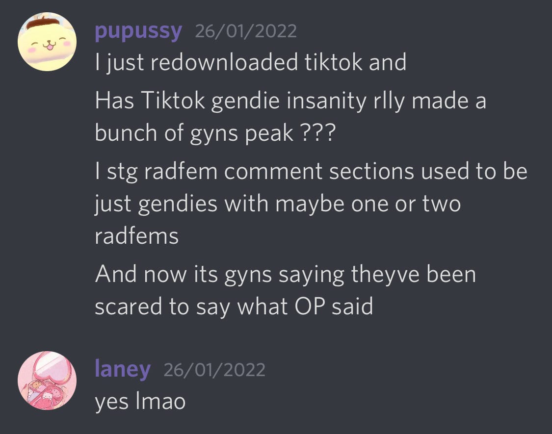 Because of this increase in ‘dark social’ usage, I decided to include Discord servers in my TERF experiment. I’ve already written about other less public social media platforms such as Giggle and Spinster, but these Discord servers 1. skew way younger and 2. often have an additional layer of privacy (we’ll get to what I mean by this in a minute). So it didn’t seem possible to get a comprehensive picture of what radical feminist discourse was like online without including Discord servers used by younger radical feminists.