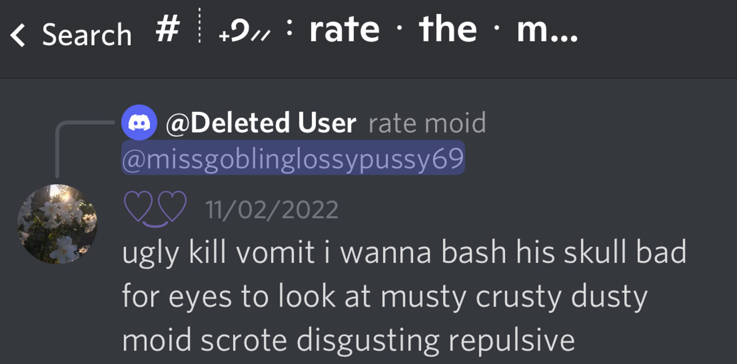 The first thing that jumped out at me about this server was a ‘rate the moids’ channel where, you guessed it, users rate men, non binary AMABs and trans women based on looks. Some are people they know in real life, others are people they’ve encountered on dating apps. The commentary in this channel is not kind, and to protect the privacy and dignity of those who were ‘rated’, I will not be sharing any identifying images.