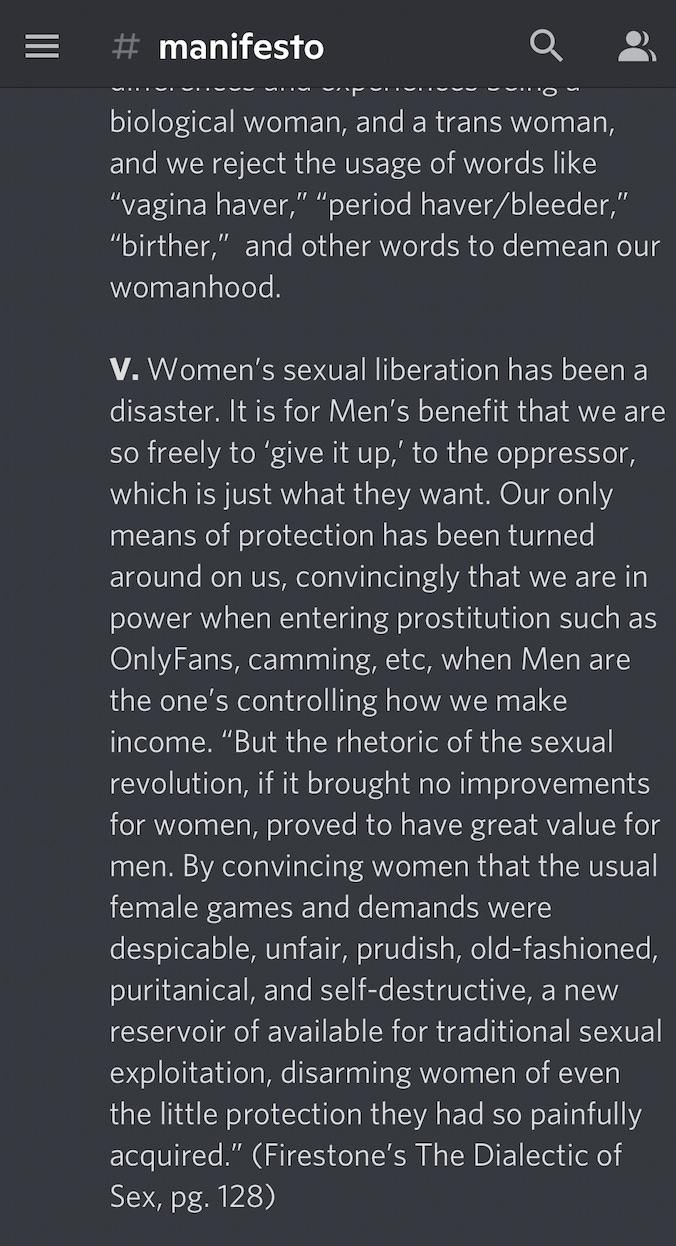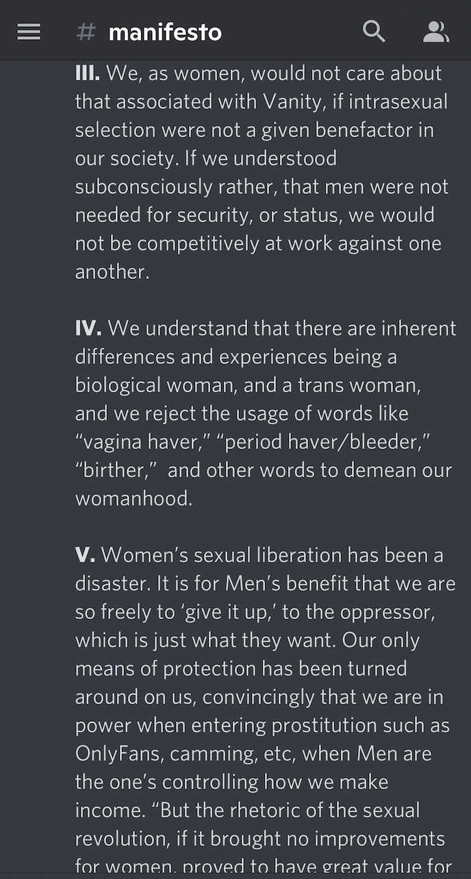 The server’s description on Disboard reads, “A discussion and safe-haven for terfs/radfems, and really any woman that is interested in feminism. We have feminist-theory discussion, along with regular chill discussions. Join to view the Manifesto if interested in reading more about us.”