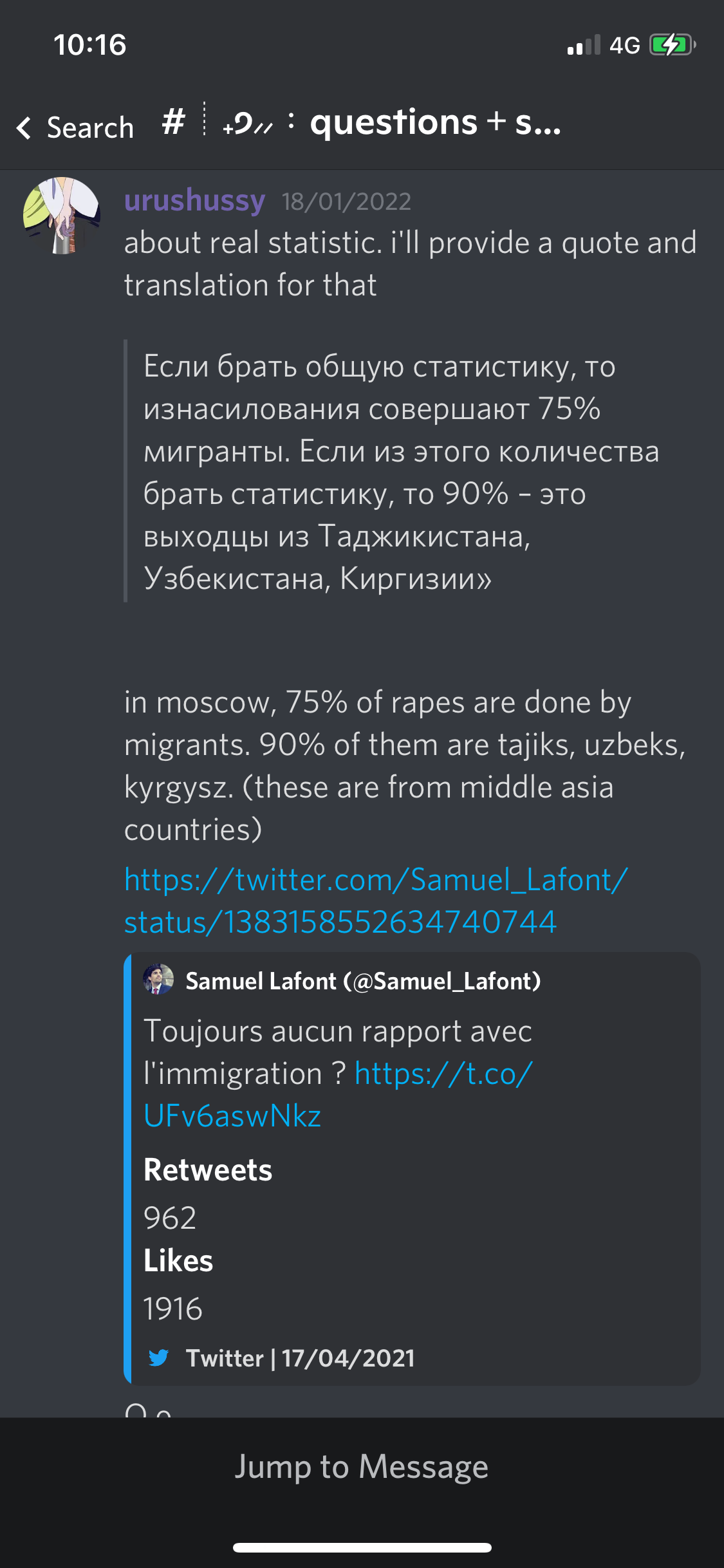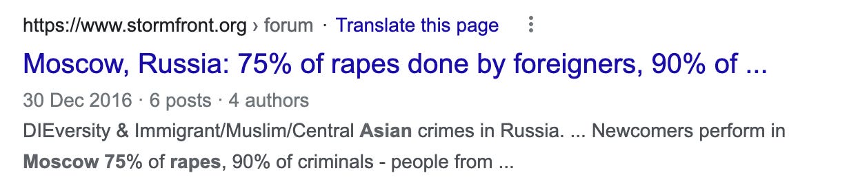 While looking for sources of this claim about rapes committed in Moscow, I found the exact statistic in a post made on Stormfront in 2016. You know Stormfront? The neo Nazi website described by the Southern Poverty Law Center as ‘the first major hate site on the internet’?