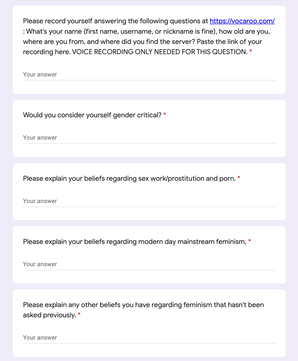 This verification form was an astonishing sight. In addition to requiring applicants to record themselves speaking (so as to confirm that they’re biologically female, I assume), the form requires applicants to answer nine ideological questions so admins can decide whether you agree sufficiently with their beliefs before permitting you to join. Questions include: